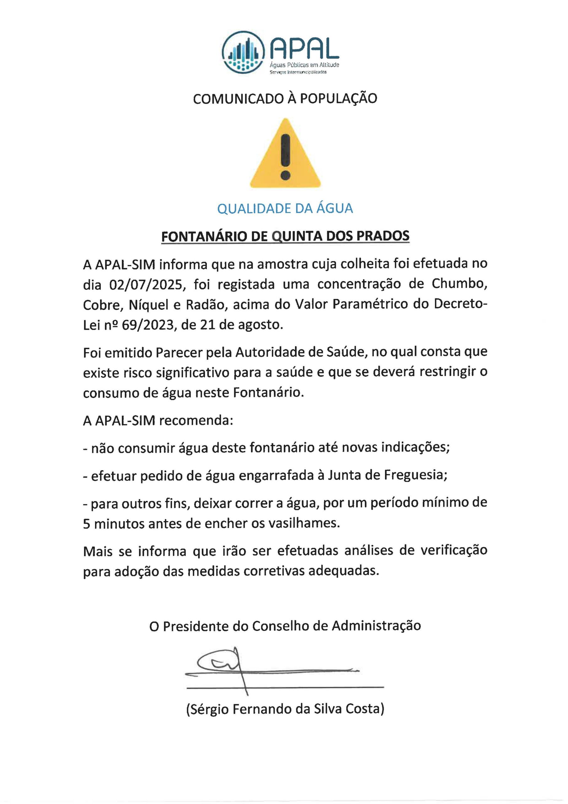 A APAL-SIM, Águas Públicas em Altitude – Serviços Intermunicipalizados, informa que na sequência de uma intervenção urgente na rede de abastecimento de água junto ao n.º52 da Rua Formosa, o fornecimento de água estará interrompido hoje, dia 27 de outubro de 2025 (segunda-feira), das 10h30 até às 12h30, nessa rua (Rua Formosa).